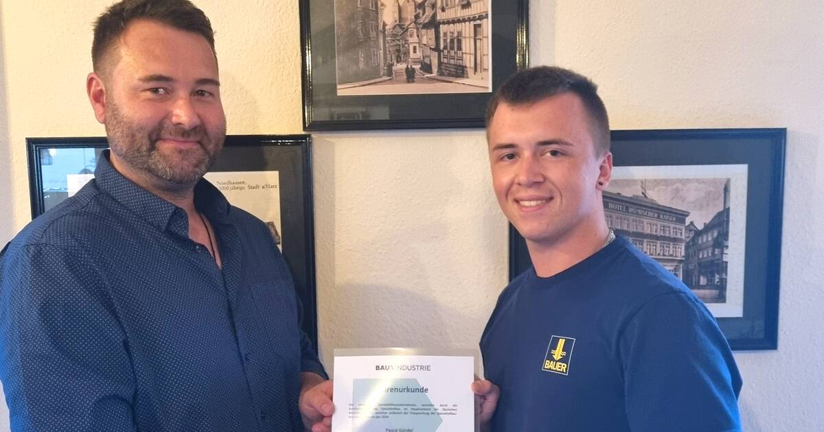 In this festive setting, the German Construction Industry Federation (HDB) also presented awards to the best apprentices - including Pascal Guendel from BAUER Spezialtiefbau GmbH. He completed his training as a specialist foundation engineer at the Nordhausen site. With an impressive result in his final exam, he is one of the top performers in Specialist Foundation Engineering 2024. He completed his training in the winter. Since then, he has been part of the Ground Improvement Department at BAUER Spezialtiefbau GmbH. “With his outstanding performance, Pascal Guendel has shown what is possible with commitment, knowledge and passion. I am delighted that he will remain with Bauer and wish him and, of course, the other three apprentices that successfully completed their training all the best for their future careers,” says trainer Daniel Hink.