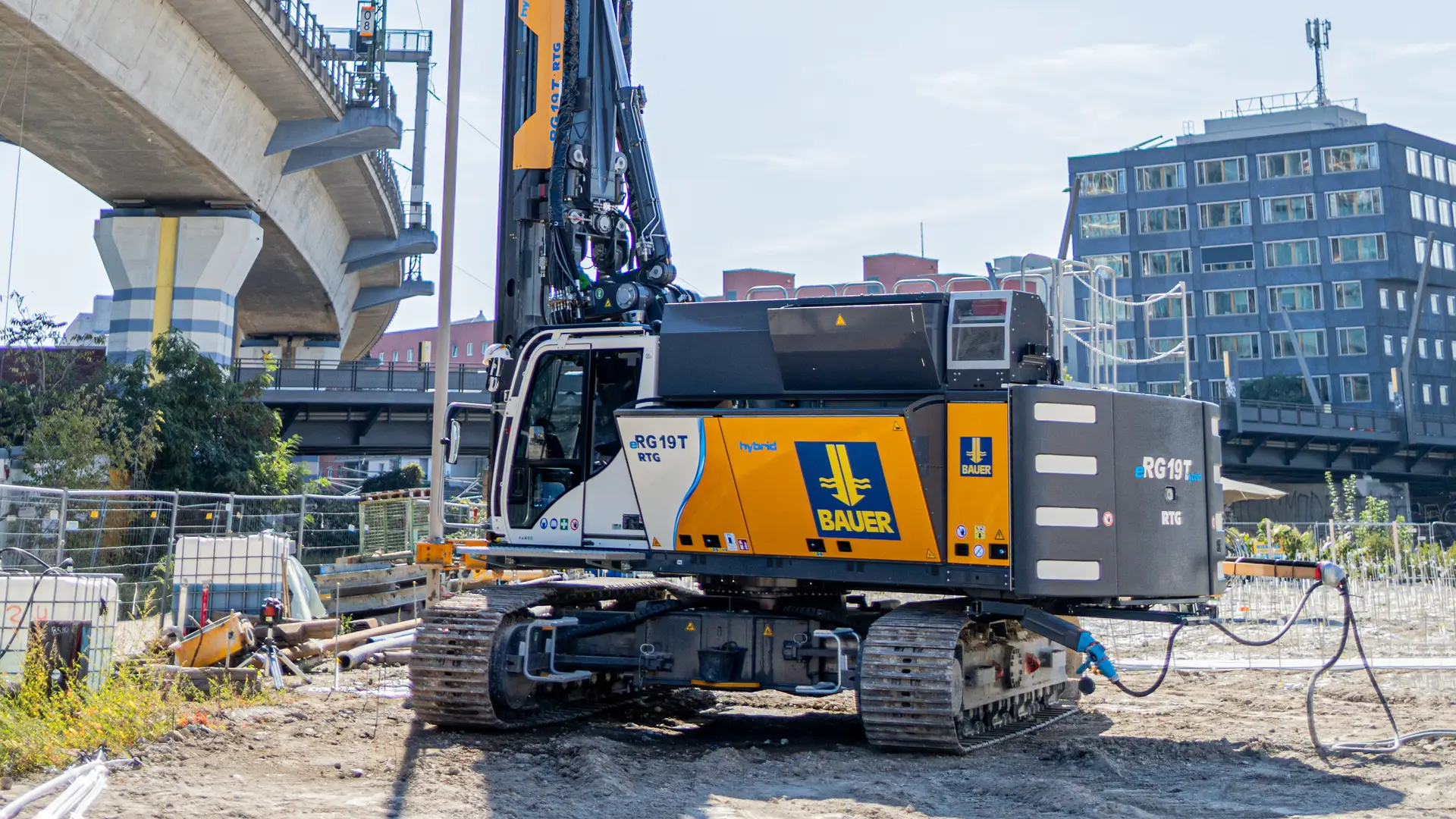 Berlin, Germany – Roaring engines, smoky exhausts and the smell of fumes and diesel – the image of a typical major construction site? Not so at Friedrich-Krause-Ufer in the German capital Berlin. BAUER Spezialtiefbau GmbH, in cooperation with RTG Rammtechnik GmbH, a subsidiary of BAUER Maschinen GmbH, relies on innovative technologies for the 32,000 m² Port ONE Berlin office project that is executed by M-Port Optima Office Center GmbH. “We want to create a better future,” stresses Lars Heilfort, Project Manager at Bauer Spezialtiefbau. “By using the new eRG 19 T hybrid, we demonstrate that construction sites can be efficient as well as quiet and low on emissions.”