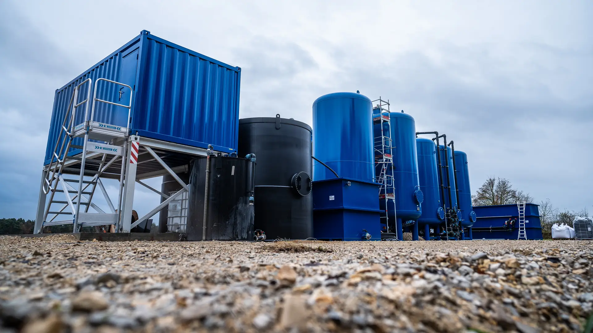 The project began in April 2024 – a technically demanding undertaking. This is because the groundwater treatment plant was customized for the client’s requirements down to the smallest detail and fabricated in the Schrobenhausen plant. “Special projects require special solutions,” emphasizes Sales Engineer Sebastian Hohlweg from the Bauer Umwelt Division of BAUER Resources GmbH, then mentions a few figures to explain the dimensions of the plant: “After all, we are talking here about a 40-foot control container, one dosing container, two gravel filters, two liquid phase activated carbon filters, five tanks or vessels and a chamber filter press.” Due to the tight schedule, the plant was completed in just 18 weeks: far from a simple task, as many components such as special pumps and filter tanks had extremely long delivery periods. “For this reason, we divided the components into time-critical and not time-critical parts during the preparatory phase to ensure a smooth working process,” continues Sebastian Hohlweg. This project is unique for the technical specialists: “I can’t remember ever building a plant this big,” proudly remarks Site Manager Harald Huebner from the Bauer Umwelt Division of BAUER Resources GmbH. With an impressive cleaning capacity of 150 m³/h, it is one of the largest plants of its kind in Germany.
