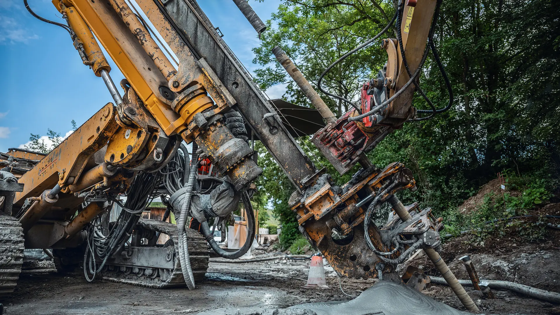The construction process is divided into five phases: First, measurement points were set up and geophysical examinations were carried out in order to document the starting station and ensure the design plans. In phase 2, the core task begins: The drilling team executes a total of 330 boreholes up to a depth of 33 m using the sonic drilling method. For this work, a special drilling rig with 3D-GNMSS measurement from BTR is used to precisely position the injection rod. Then the experts from Bauer Spezialtiefbau will execute the sealing injections using the specially configured KLEMM KR 806-2DB. A total of approx. 8,000,000 L of mortar developed in-house is expected to be inserted into disrupted soil strata, following an exact step-by-step process. This phase alone is expected to take 20 months. Phase 3 consists of more geophysical examinations and cable coring drilling works. Phase 4 involves follow-up treatment with cement injections to fill in remaining gaps.